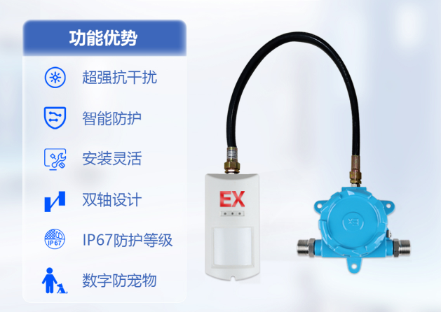 防爆型红外微波三鉴探测器:针对厂区内部关键区域(如储罐区、装卸区、控制室),系统配备防爆型红外微波三鉴探测器,通过“红外+微波+智能分析”三重技术融合,实现“智能识别+快速响应”:当有人或物体进入探测范围时,红外传感器感知热量变化,微波传感器检测移动,双重信号同步传输;内置智能分析算法对信号进行验证,有效过滤小动物、树叶晃动等干扰,降低误报率;确认入侵后,探测器立即发出报警信号,并联动监控中心弹出现场画面,确保安保人员快速响应。其“本质安全”设计同样适配易燃易爆环境,目前已在多个危险品仓库、燃气站等场景稳定运行。