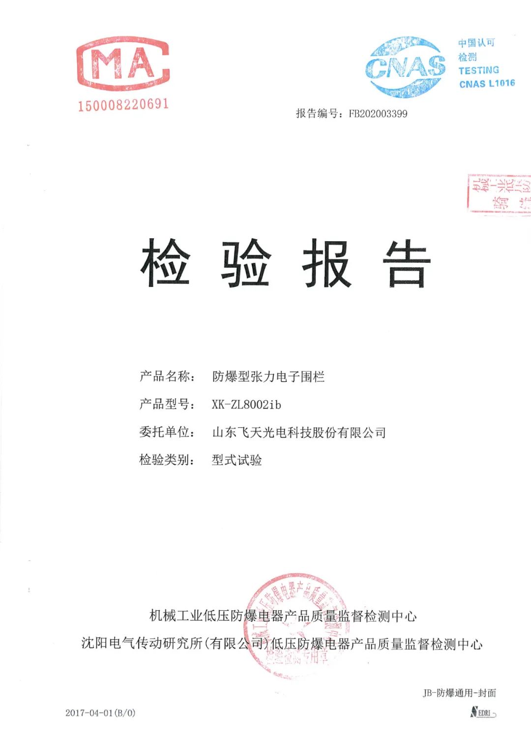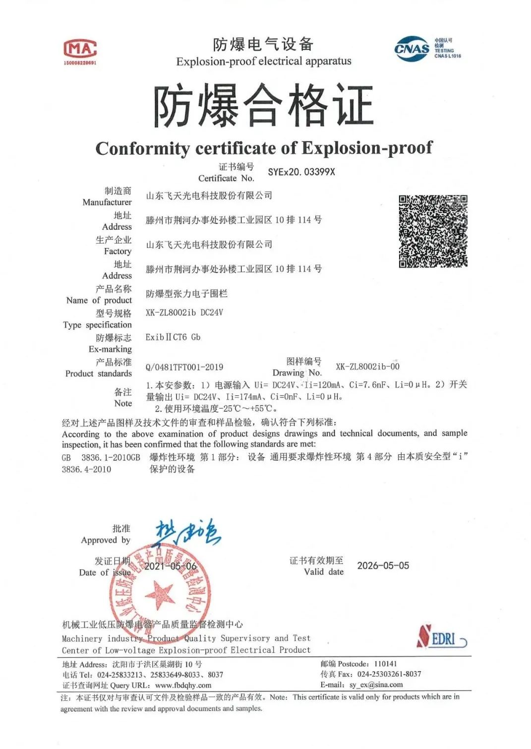 近日,由飞天激光首创研发的防爆激光光栅、防爆张力电子围栏,已通过相关部门的审查和样品检验,于2021年9月正式获得了防爆合格证证书,这标志飞天激光在易燃易爆场景新产品的研发和标准化方面又取得了新的进展!