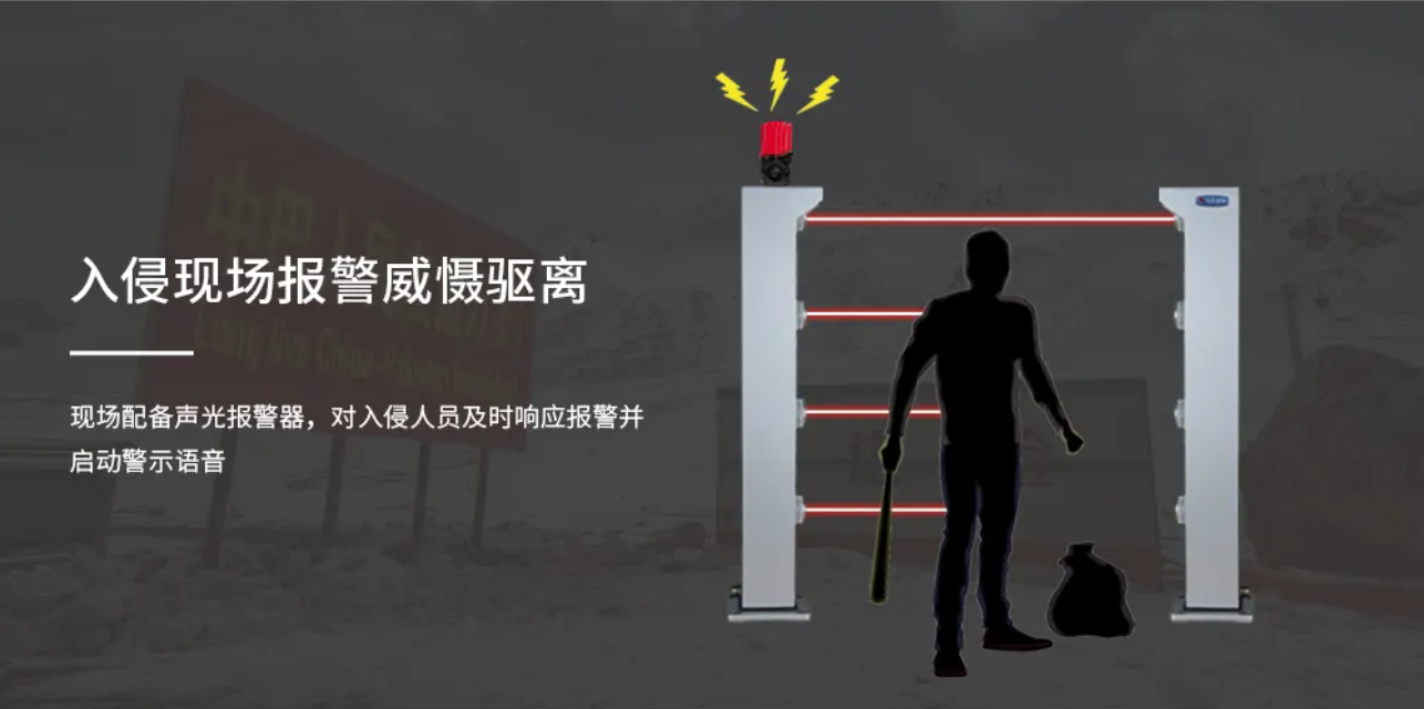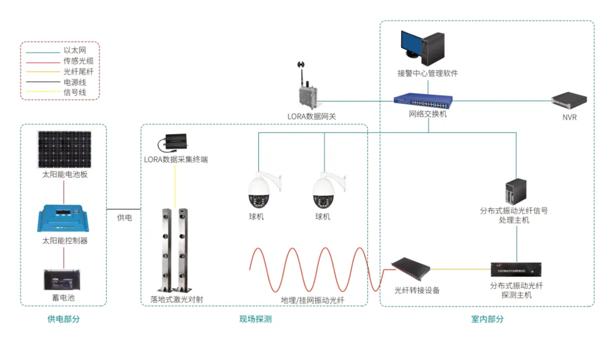 针对边境无网无电情况,采用太阳能供电落地式激光对射入侵探测器,Lora无线传输,相互中继,安装组网方便,实现长距离防护。