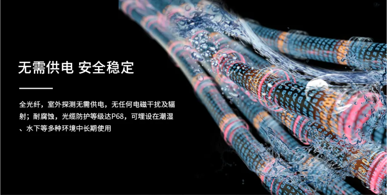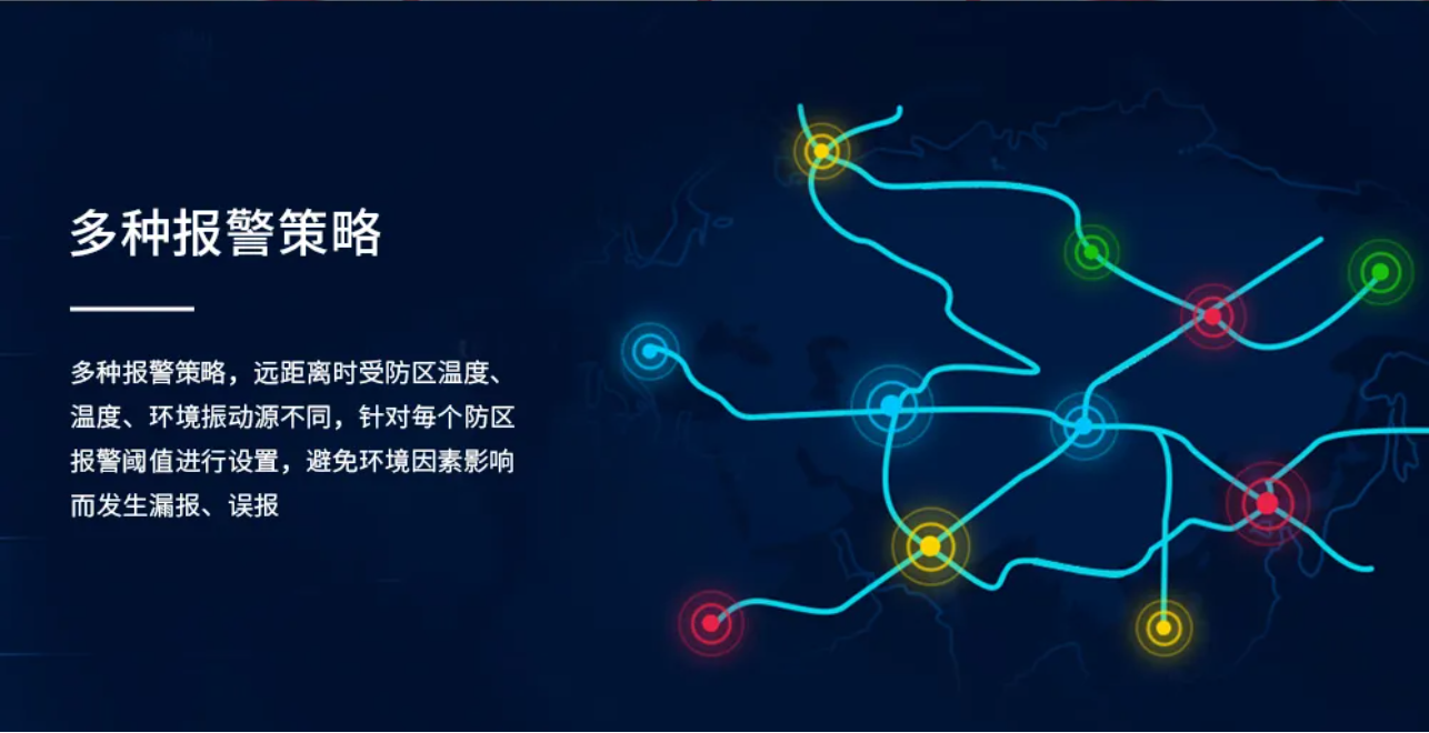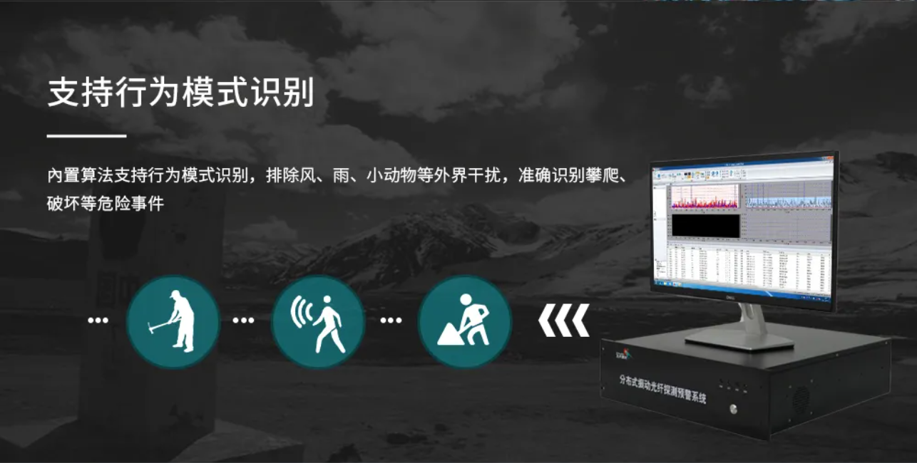 采用分布式振动光纤入侵探测系统,系统所用的是高度相干的脉冲光源,通过检测不同时刻、不同位置的瑞利散射光信号的强度变化,检测出振动信号作用在光纤上的具体位置。分布式振动光纤入侵探测系统可实现双通道长达100公里预警监控,定位精度高达2m,特别适用于长距离边境防护应用场景。