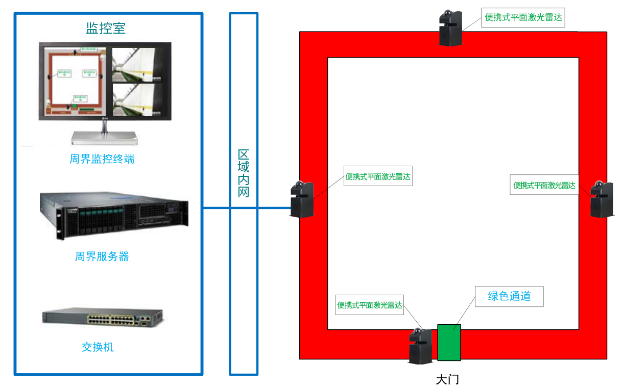 考虑到军用临时物资的重要性,例如装备器材、军需物资、医疗物资、营房物资、通用物资、防暴装备和警用器材等。针对临时物资调动性强这一因素,飞天激光设计了便携式平面激光雷达探测系统,可随时随地设防。