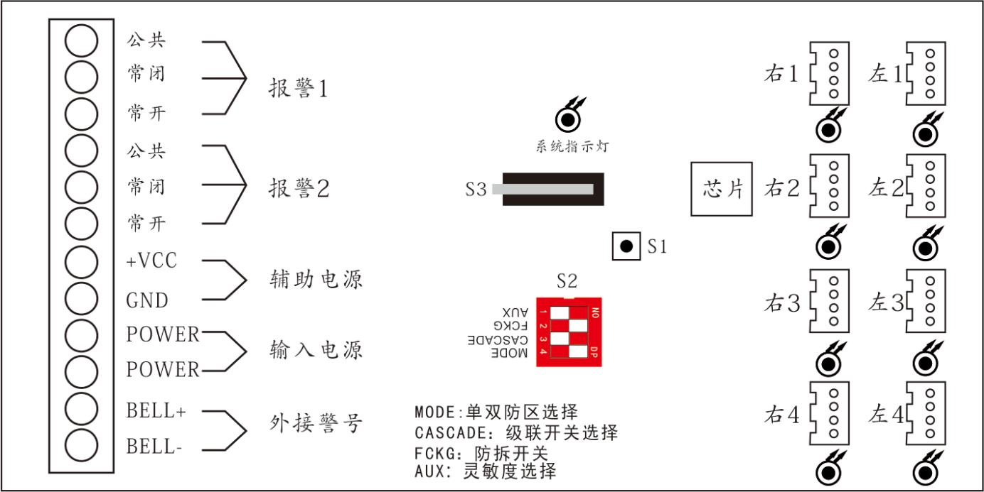 另外对于主机的调试,按照以下3个步骤进行:1.检查各端口接线是否正确。2.接通电源,左1至左4,右1至右4八个端口指示灯为依次点亮,进行张力线自适应。3.调节紧线器至灯灭,灯常亮表示张力线比较松弛,需要调紧“紧线器”至灯灭,灯慢闪表示张力线过紧,需要调松“紧线器”至灯灭,灯灭表示正常。