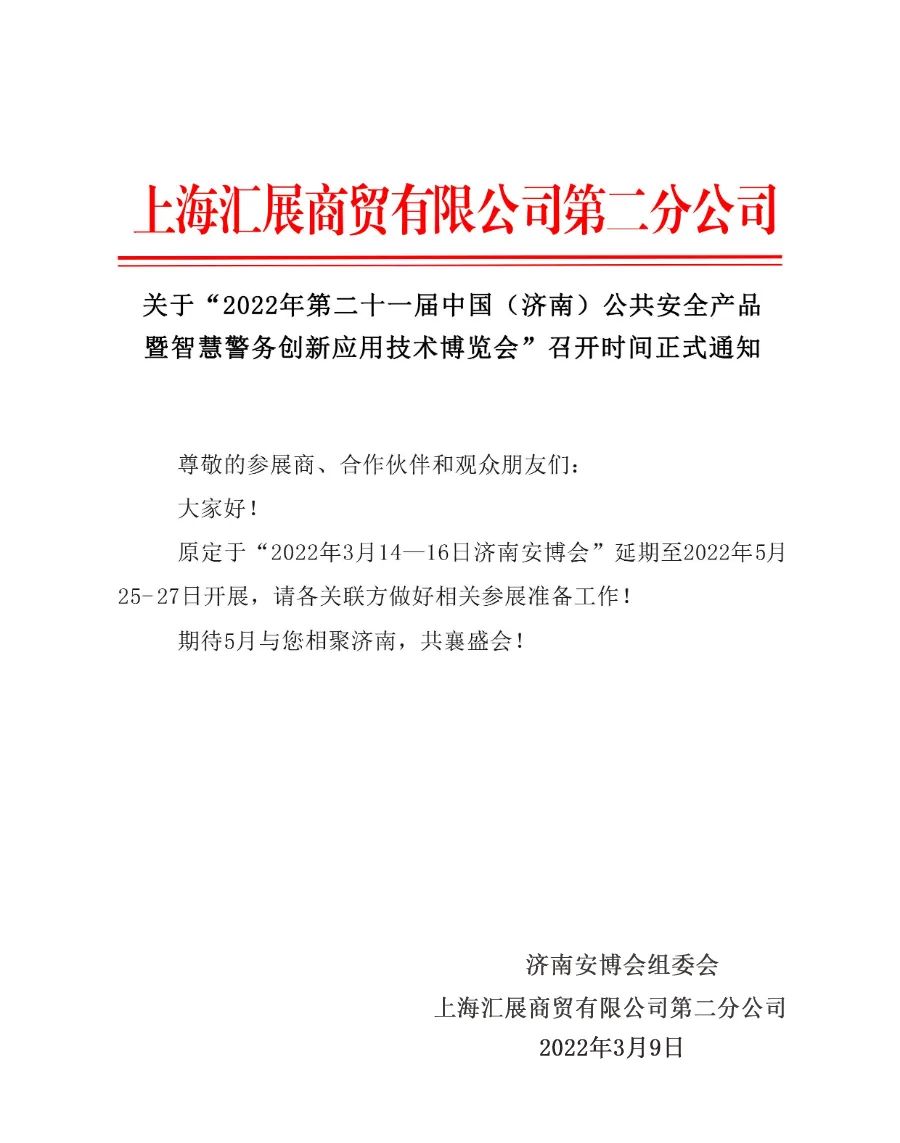 在济南市商务局、济南疫情疾控中心指导下,为了确保参展商的展出效果及参会人员的出行安全,组委会多次与各关联方沟通,最终决定济南安博会延期至2022年5月25日—27日举办。