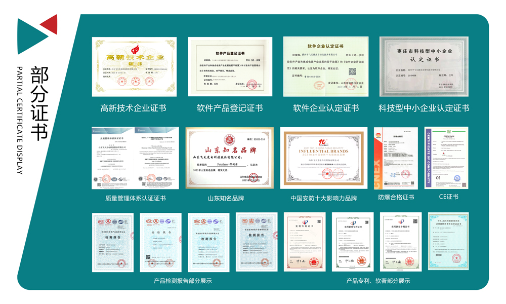 正是因为飞天光电13年来在采购、研发、生产等环节管控上的孜孜不倦,获得众多权威机构的认证与肯定。先后荣获ISO9001国际质量体系认证、多项3C认证,获得国家高新技术企业、国家重点新产品、山东知名品牌、中国安防十大影响力品牌等重量级荣誉。