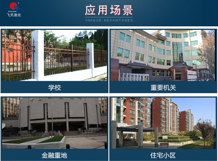 振动光纤周界安防系统一种新型安防系统,它是利用光纤作为感应体来探测外界扰动并判别是否属 入侵行为,发出报警信号的系统。这是近年来在国际上发展起来的光纤应用新领域,山东飞天激光研制的新一代振动光纤周界防范系统性能稳定、应用广泛,可广泛应用于易燃易爆及强电磁干扰等场所,如石油石化油库,液化气厂、危险品仓库、军用品仓库等;重点设施及区域的防范,如机场、铁路、司法监狱、自来水厂,电力及管道设施等;普通民用领域如厂区,小区住宅,私人别墅等。