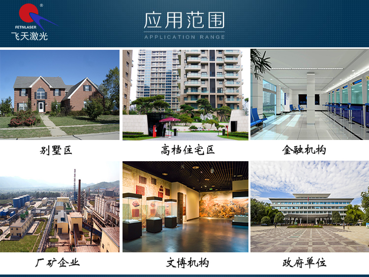 山东飞天的民用型产品借助激光的光源优势,对应红外对射、栅栏在稳定性、可靠性、抗干扰能力、能耗、性价比等各方面具有全面的优势,可以全面替代红外对射产品,大量进入普通家居和周界报警防范中,可广泛应用于高档小区、别墅、政府单位、金融机构、文博机构、厂矿企业等场所。使激光周界探测技术真正走进千家万户,让社会更安全、让生活更安心。山东飞天光电科技股份有限公司是一家专业研发、生产、销售激光光电探测系统的科研驱动型高新技术企业。立足周界报警、坚持科技创新的战略方针,历经14年的沉淀与发展,已成为中国安防行业-激光周界探测领导者。激光对射入侵探测器是山东飞天激光的高端自主产品,已通过ISO9001国际质量体系认证、3C强制认证、CE认证、I类安全激光认证,智能交通、技术安防、智能型等系列产品不断优化创新,并已广泛应用于能源、交通、军事、司法、文博卫、科研院所、工矿企业。